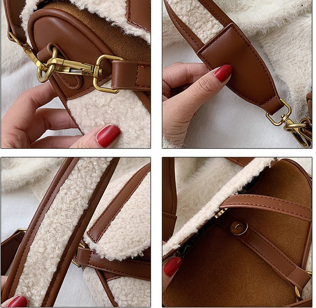 В комплект входить плечовий ремінь з екошкіри і штучного хутра. Також є невеликий ремінець для носіння сумки в руці. Фурнітура металева.
