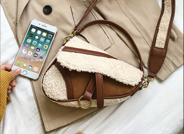 Має одне відділення. На підкладці. Застібається на магнітну кнопку. На клапані два декоратинвіх ремінця. Сумка виготовлена з комбінації екошкіра і штучного хутра, що імітує стрижену овчину. Сумочка середньої жорсткості, добре тримає форму.