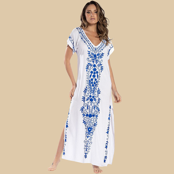 Туніка-плаття жіноча пляжна біла з голубою вишивкою довга з розрізами