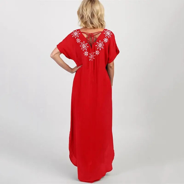 Красиве літнє плаття-туніка з тонкої тканини. Може використовуватися як пляжний одяг або як комфортне повсякденне плаття в спекотний літній день.