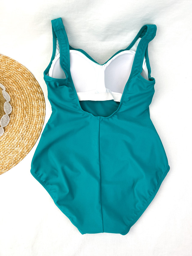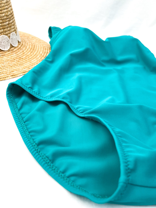 Жіночий злитий, однотонний купальник, бірюзового кольору. Бюст з підкладкою, оснащений пришитими поролоновими чашками. Існують гумки для підтримки молочної залози. Сам купальник щільний, без підкладки. Фасон купальника чудово сідає по фігурі. Тканина щільна, еластична і не прохолоджується.