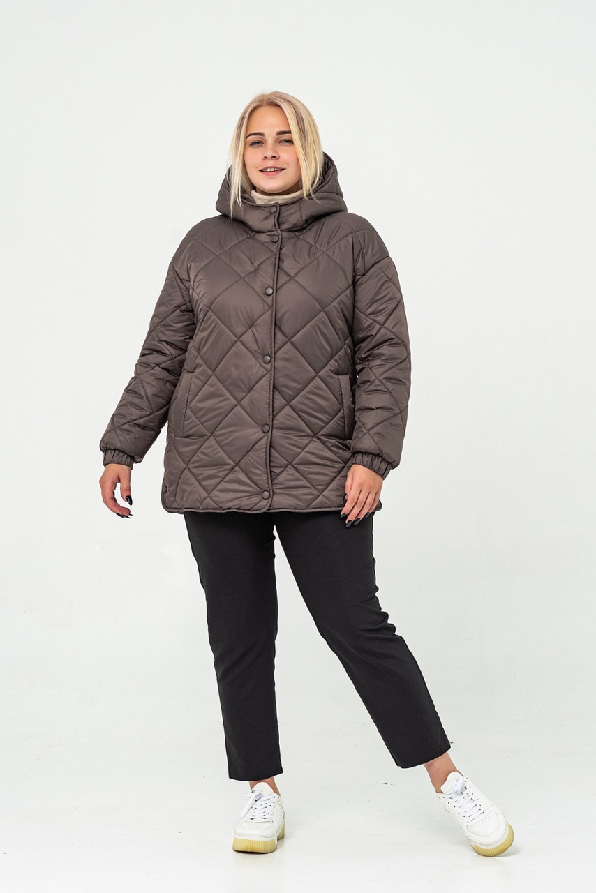 Куртка жіноча коричнева демісезонна стьобана з капюшоном великого розміру