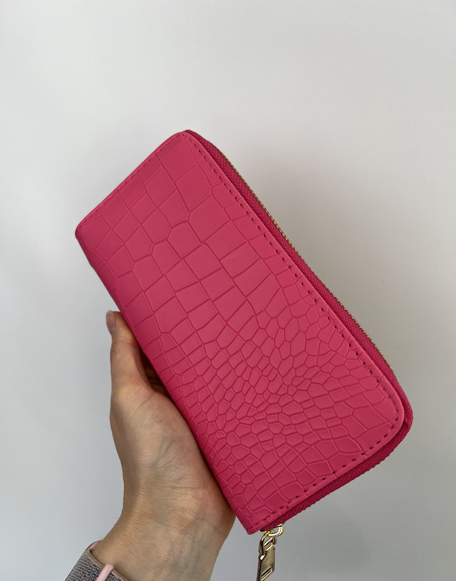 Жіночий гаманець подвійного складання. Виготовлений з якісної екошкіри з малюнком під крокодилову шкіру. Закривається на блискавку. Усередині два відділення для купюр, є перегородка на замочку у формі відділення для монет. Також є 8 відділень під картки. Гаманець-портмоне досить місткий, всередині можна носити телефон.