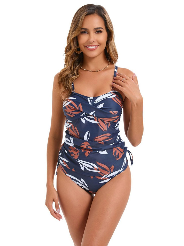 Купальник роздільний закритий танкіні майка і трусики синій з малюнком листочків білого і коричневого кольору. Майка на бретелях, які пришиті до основи виробу і зі складками по бокам для регулюання висоти майки за допомогою шнурків. Бюст з поролоновими вставками які при необхідності можна дістати. Довжина бретель регулюється. Спереду бретелі кріпляться за пластмасові золотисті кільця, на спині на металеві срібні кільця. Трусики - сліпи. Спереду купальник на підкладці сітці білого кольору. Тканина купальника гладка, м`яка і еластична.
